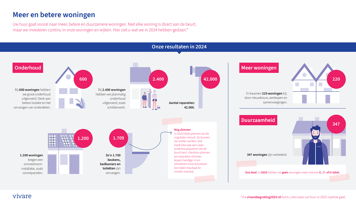 Bekijk de infotekening hieronder voor een overzicht van wat we in 2024 hebben gedaan. Liever groter bekijken? Klik dan op de link hiernaast: infotekening. Op vivarebegroting2025.nl kunt u zien waar uw huur in 2025 naartoe gaat.