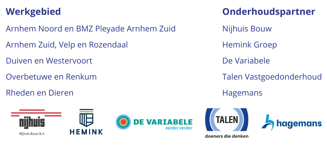 Vivare werkt samen met verschillende onderhoudsbedrijven. Hieronder ziet u per gebied welke bedrijven reparaties en onderhoud doen aan onze woningen. Per 1 januari 2025 is dit veranderd. Huurders hebben hier een brief over gekregen. Meer informatie vindt u op deze pagina.