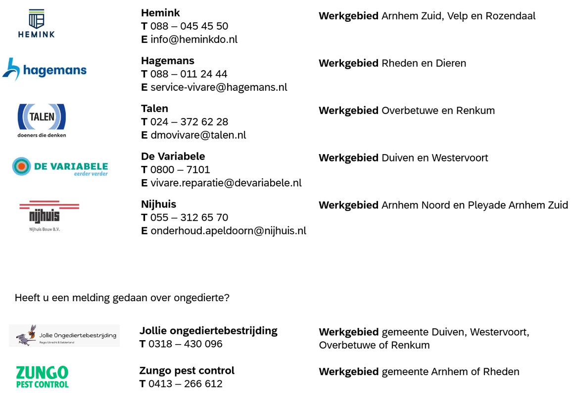 Heeft u een reparatieverzoek gemeld die door onze externe onderhoudspartners wordt uitgevoerd? Heeft u vragen over de planning of het verloop van uw reparatieverzoek? U kunt direct contact opnemen met de desbetreffende onderhoudspartner. Let op: neem alleen contact op met de onderhoudspartner wanneer u een lopend reparatieverzoek heeft.